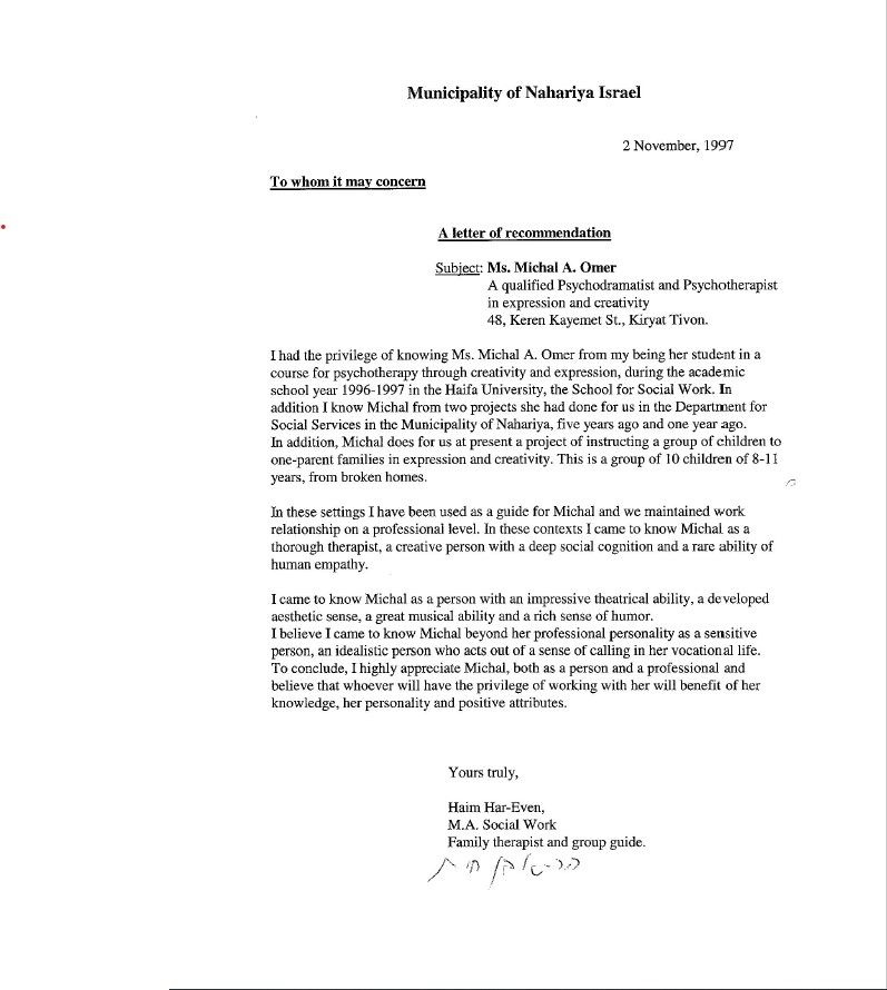מיכל היא יצירתית מאוד, בעלת רמה גבוהה ביותר של אחריות מקצועית. אישיותה נעימה מאוד, ואין לי ספק ביכולתה לתרום מכישוריה המקצועיים
